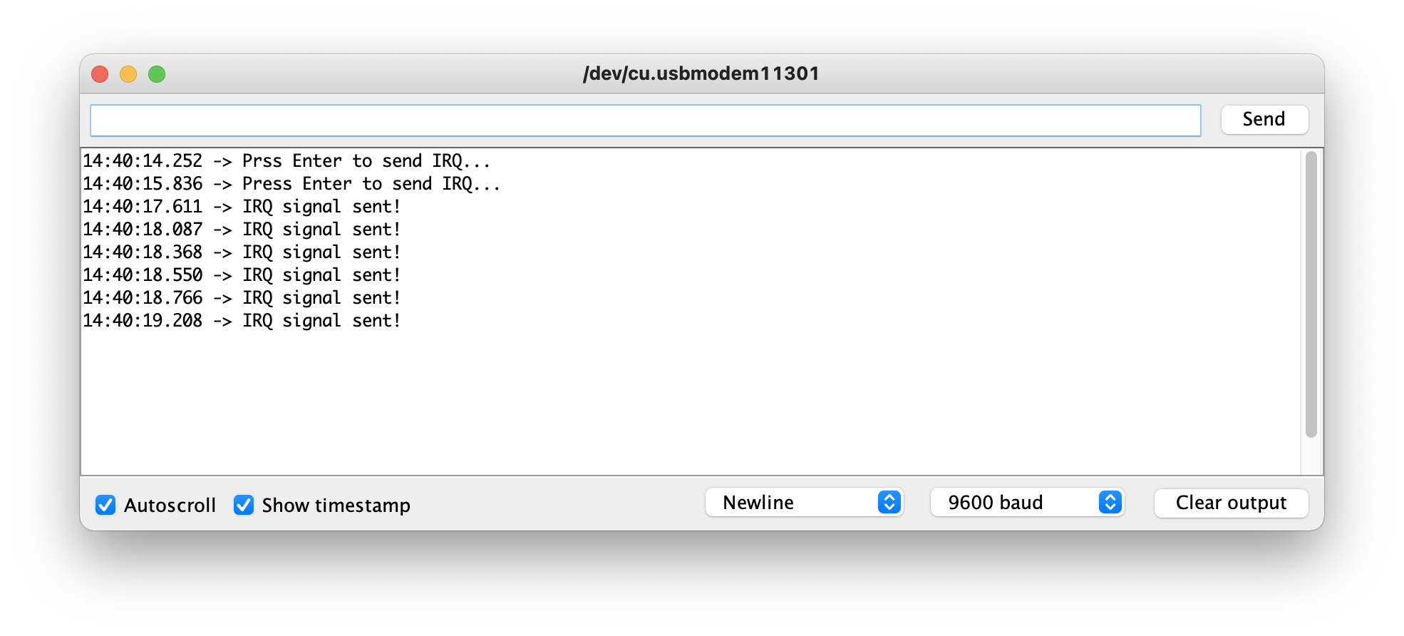 You can now fire IRQ manually by sending pressing return to Serial Monitor in Arduino IDE: