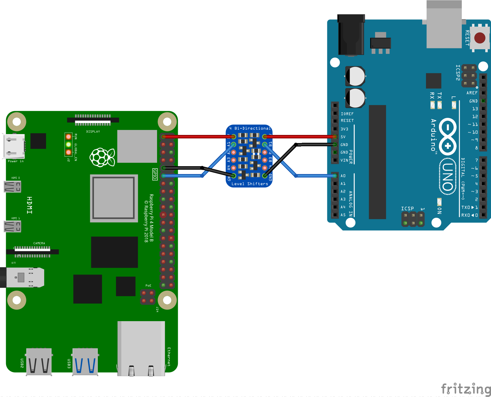 A0on Arduino Uno through proper interface (e.g. a logic level shifter) toGPIO17on Raspberry Pi 4B: -