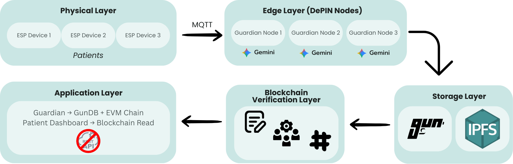 A decentralized health monitoring system using ESP32 IoT sensors, blockchain, and a modern dashboard. Eliminates single points of failure and enables permissionless deployment.