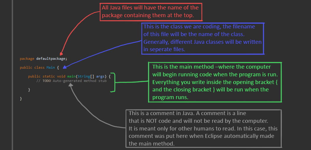 In this case, we will write our code in the 'main.java' file. When you first open up this file, it looks like the image below. I have included descriptions of what the different lines of text are.