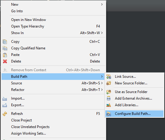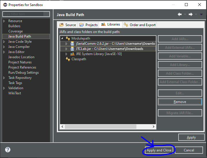 Brows to the location in which you downloaded the above JAR files and add both files to the build path. It should look like the below image when you finish. Select 'Apply and Close'.