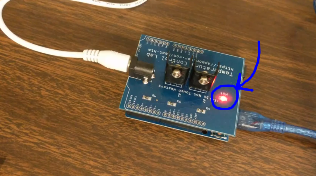 The red LED on top of the temperature control lab should light up and stay red for 5 seconds, then turn off.
