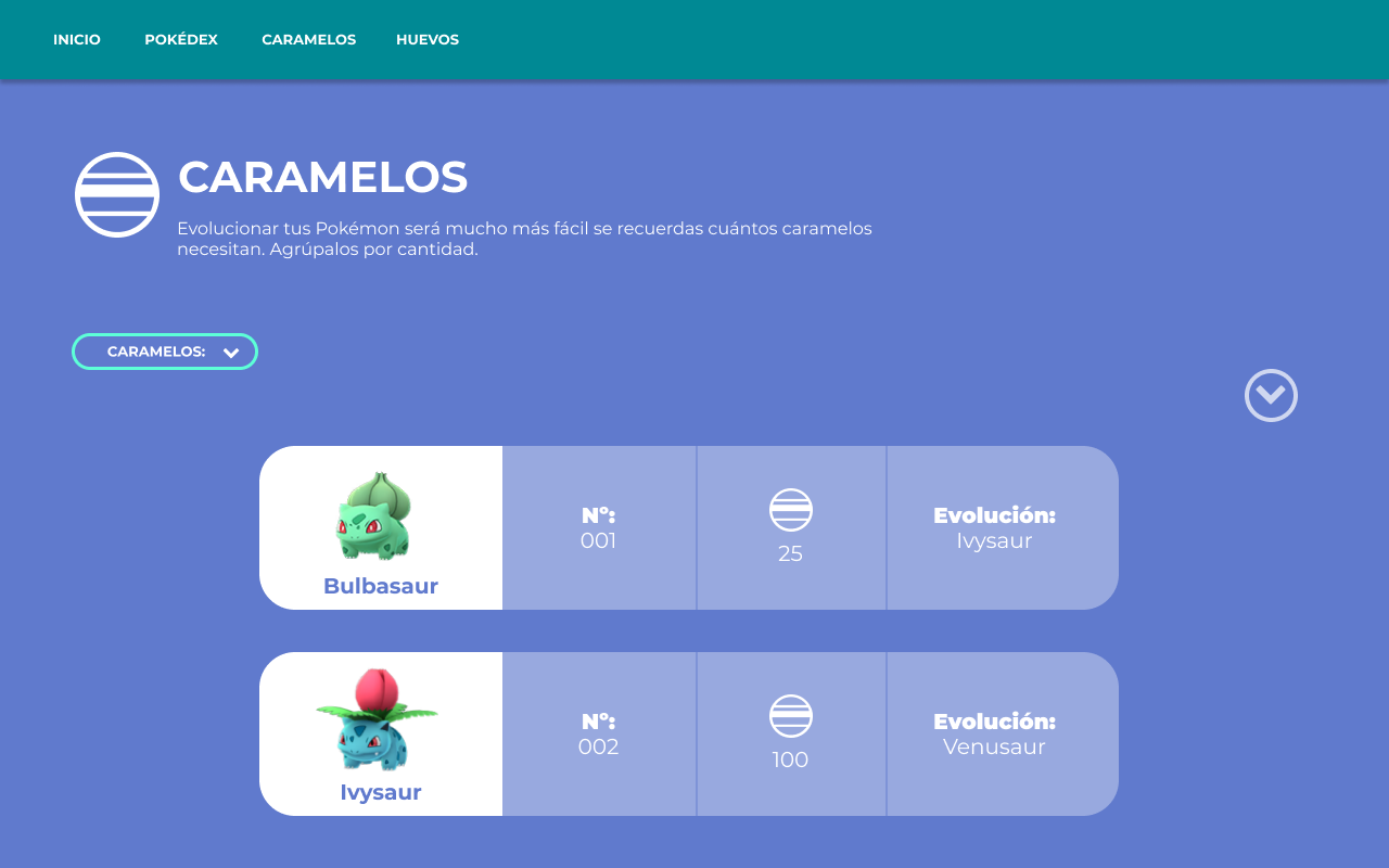 Criterios de aceptación: En el menú se encuentra la categoría "Caramelos", haciendo click accede a una nueva pantalla donde verá todos los Pokémon y por medio del filtro de caramelos el usuario podrá agrupar la información que necesita clasificar.