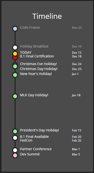 #4b4b4b, timeline line/dots#E8F770— matching the original widget's colour scheme.The layout mirrors the original dashing-timeline: each row uses flexbox with the date right-aligned on the left, a dot centred on the vertical line, and the event title on the right. Each dot has a white semi-transparent border ring and supports an optional per-item colour via the