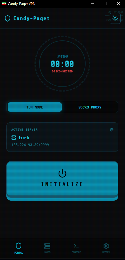 Candy-Paqet is a professional-grade VPN client focused on speed, security, and a premium user experience. Built on top of the powerful paqet engine and sing-box tunneling service, it provides a seamless interface for managing complex network connections with a stylish "Cyber HUD" interface.
