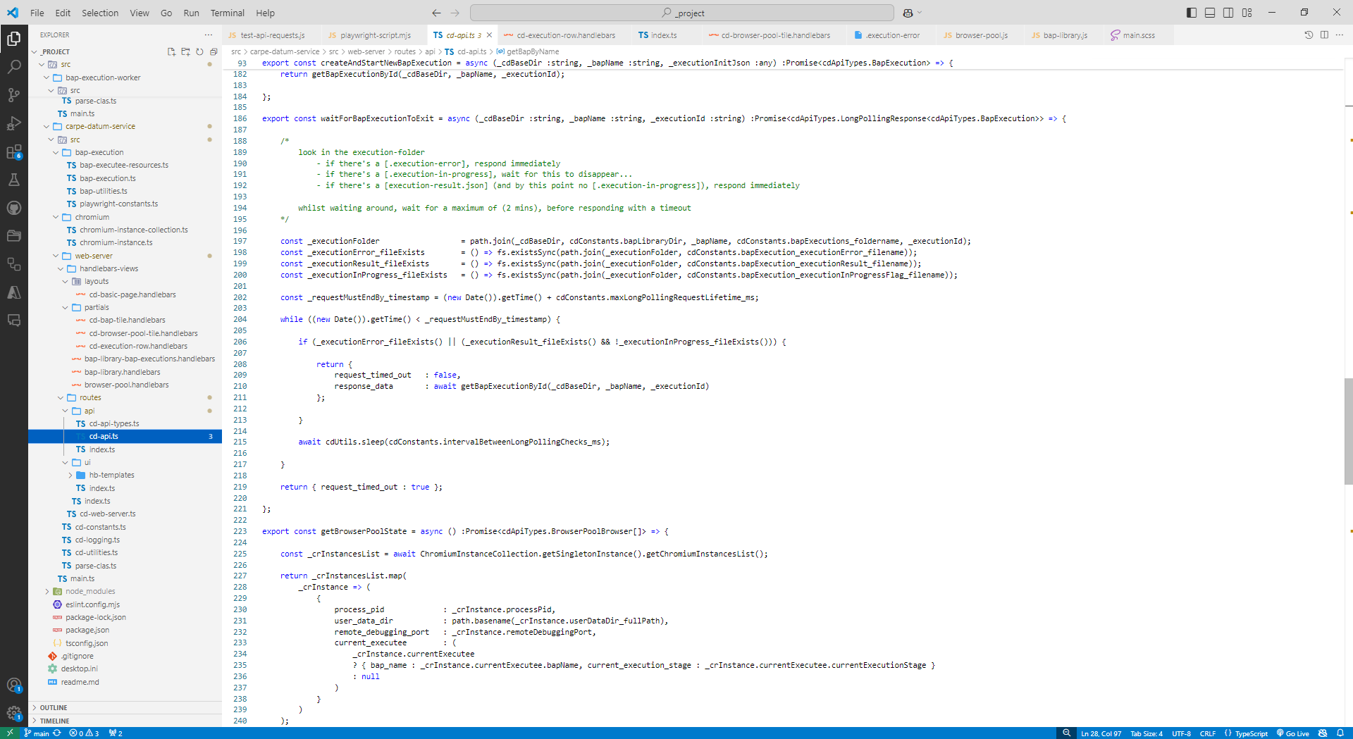 carpe-datum-service, which listens for bap-execution requests on a http API. - The server maintains a pool of headless chromium instances, which are