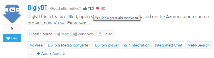 - If you have an alternativeTo account, go to alternativeTo, type in a bittorrent client name that's similar to BiglyBT (there should be at least one that's VERY similar to BiglyBT!), and add BiglyBT to its alternatives list. You can also click the heart beside BiglyBT if you want ^^'