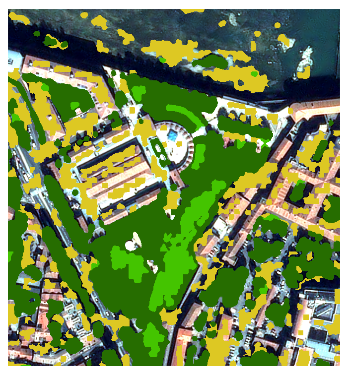 Vegetation mask are computed with an unsupervised clustering algorithm. First some primitives are computed from VHR image (NDVI, NDWI2, textures). Then a segmentation is processed (SLIC) and segments are dispatched in several clusters depending on their features. A final labellisation affects a class to each segment (ie : high NDVI and low texture denotes for low vegetation).