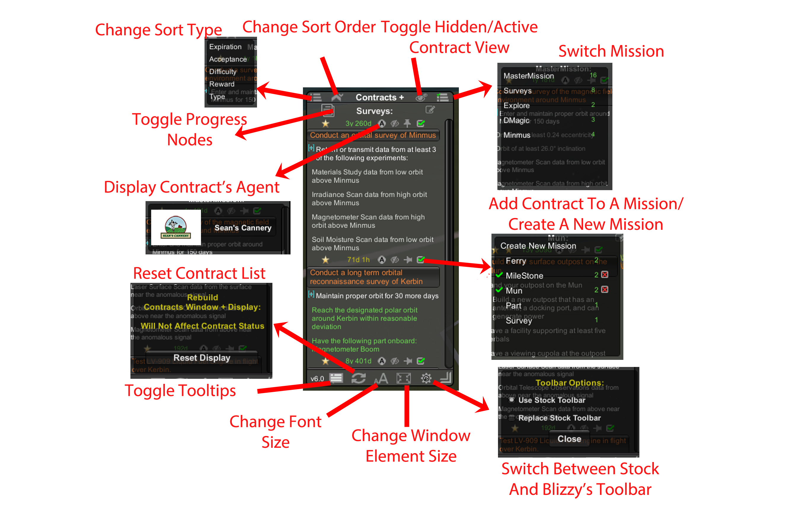 - This should generally not be needed, but if there are errors in the contract window (no contracts displayed, no "MasterMission" contract list, the window is too small, etc…) this can be used. All window size, font size, and position options will be reset; the internal list of contracts will be updated with all active contracts and the "MasterMission" will be reset with this internal list. All other mission lists should be unaffected, these can be manually deleted if there are any other problems.