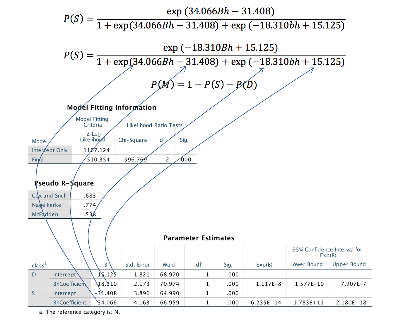 It is the screenshot of the output generated by SPSS. “Bh Coefficient + Labels.csv” is used as the input to SPSS. The following explains how the model in Sec. 5.3.2 corresponds to the SPSS output. Formally, our logistic regression model is