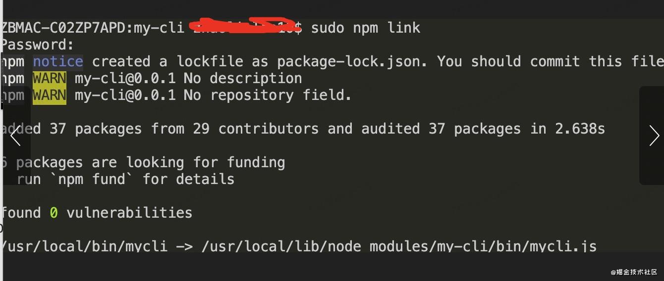}万事俱备,为了在本地调试,my-cli文件夹下用npm link,如果在mac上需要执行 sudo npm link