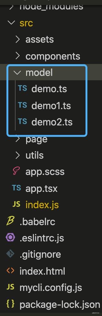 我们接着用mycli创建的项目作为demo,我们在项目src文件夹下面新建model文件夹,用来自动收集里面的文件。model文件下,有三个文件 demo.ts , demo1.ts ,demo2.ts ,我们接下来做的是自动收集文件下的数据。