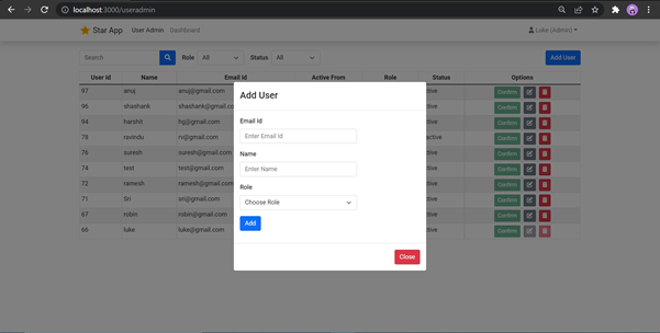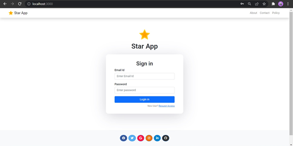 Landing Page: It is the Landing page of our Web App Consisting of Star App Logo and Brand name of our web app and Sign in Screen with Request Access (Sign Up) Link, Footer with different Websites Link Buttons and About, Contact and Policy Tabs.