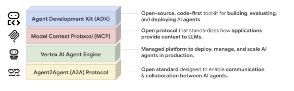 b.框架(中间层):构建代理的 “工具包”,比如 Google 的 ADK、LangGraph、Crew AI,提供代码模板、部署工具,帮开发者快速搭代理