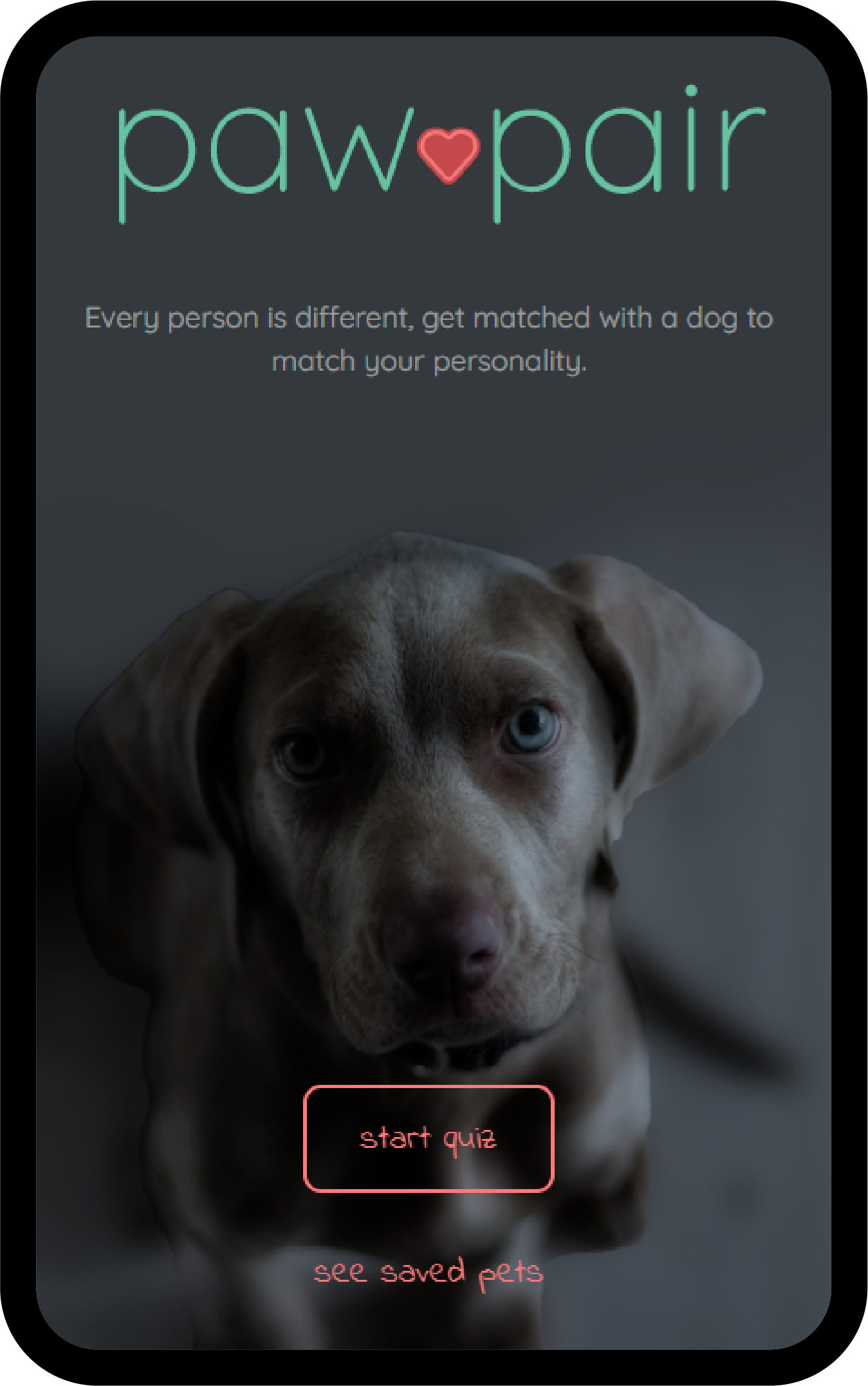 Paw Pair is a simple, fun tool for getting matched with your perfect pet companion. Skip the busy, hard to use pet finding websites and try this simple, delightful quiz tool instead.