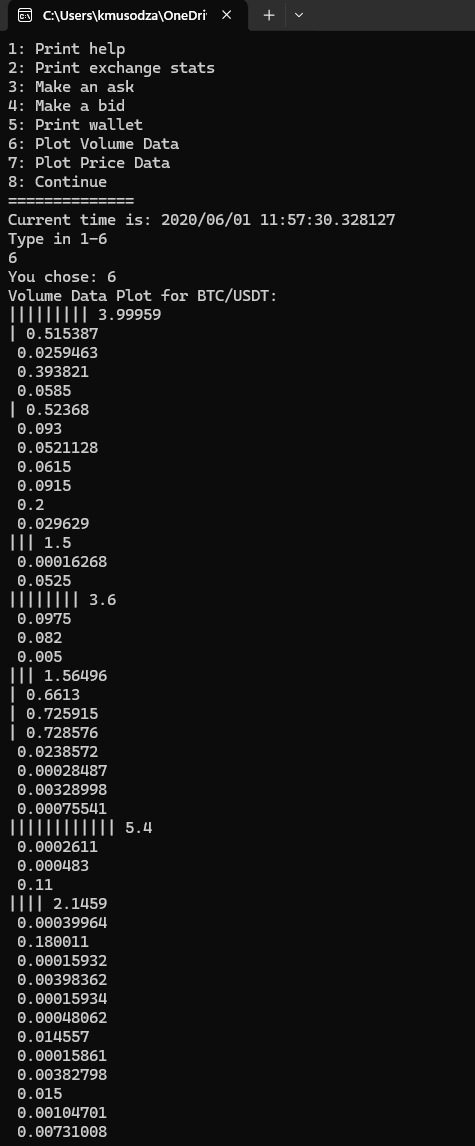 Text-Based Plots: The system offers text-based plots for visualizing trading data. This includes plotting volume data and price data using appropriate characters to represent data points.
