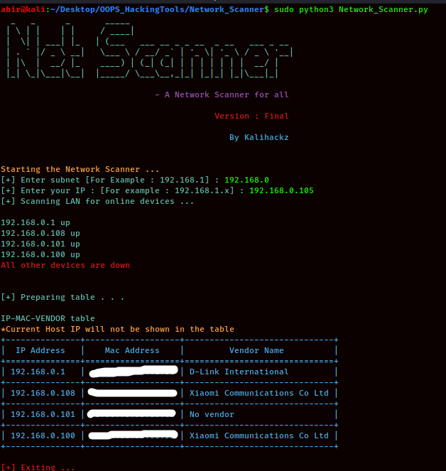 after scanning.It uses scapy and getmac to scan LAN and get MAC address respectively.Need some modules for python :