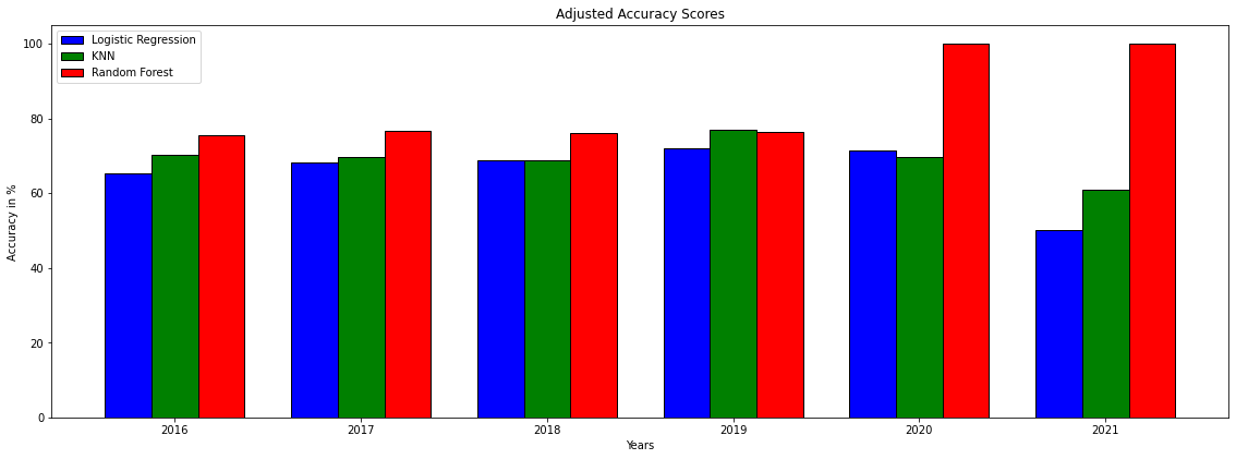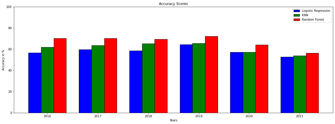 The first thing that pops out in most of these charts is 2020 and 2021. These years were heavily effected by the Covid pandemic and it can be assumed that normal years will look more like 2016-2019. Even so looking at this chart Random Forest has only further confirmed its standing as the superior model to use and that is the model that I decided to move forward with.