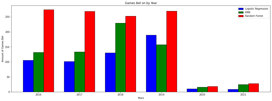 This still had Random Forest leading when it comes to accuracy but because of my new adjusted accuracy function it is also important to see how many games each model is selecting. That can be seen in the chart below: