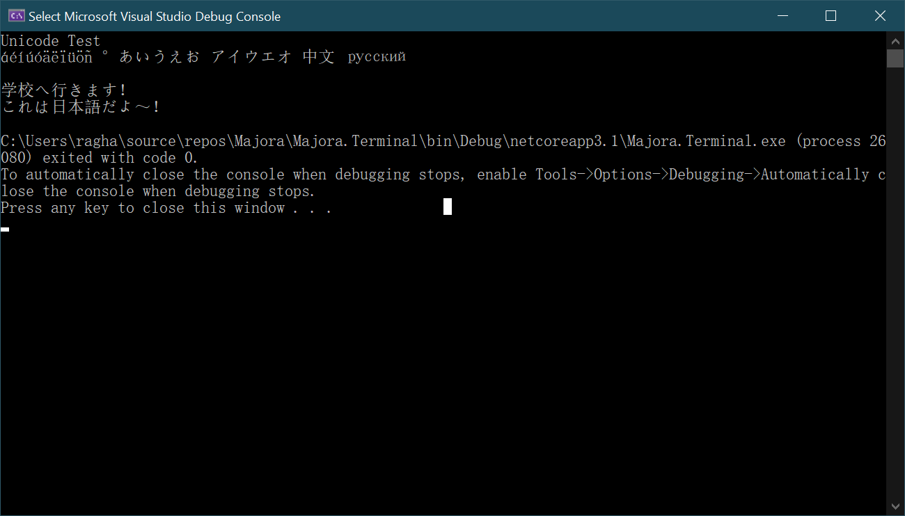 Console.WriteLine("Unicode Test\náéíúóäëïüöñ ° あいうえお アイウエオ 中文 русский\n");