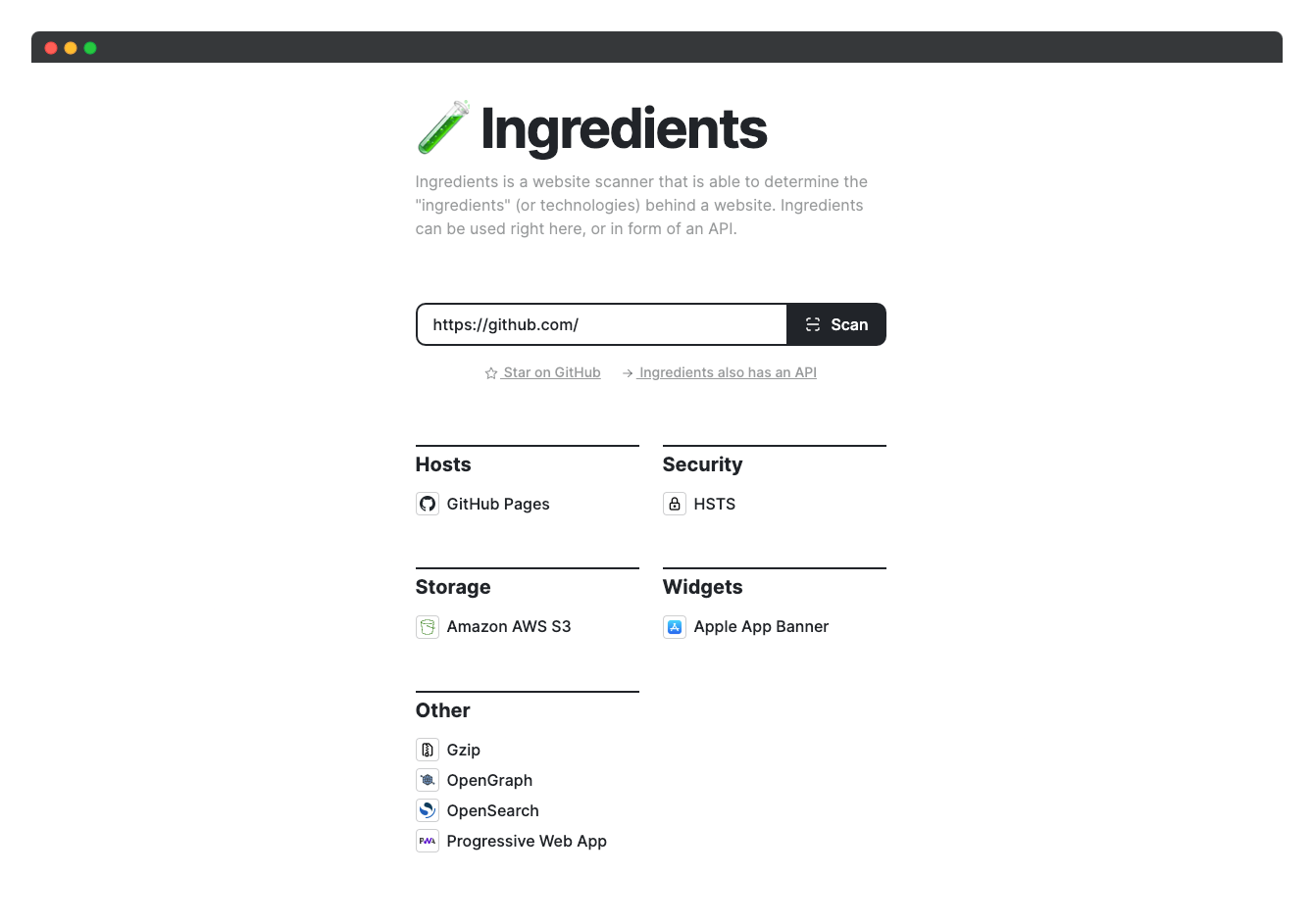 Ingredients is a website scanner that is able to determine the "ingredients" (or technologies) behind a website.