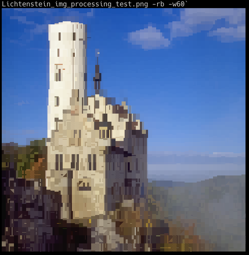 The braille renderer converts the input image to greyscale and maps 2x4 pixel blocks directly to a braille pattern. Then the foreground color is determined by the same technique as the block renderer.