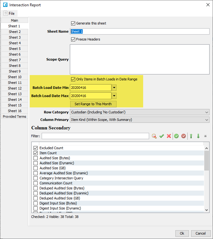 Each sheet can now be scoped to items which belong to a batch load which has a "loaded" date that falls within a specified range. Nuix search does not currently support searching for items based on their batch load's date (only its batch load GUID). The script will do the work of locating which batch loads fall within the specified date range and updating the sheet's scope criteria to scope the items to those within the located batch loads.