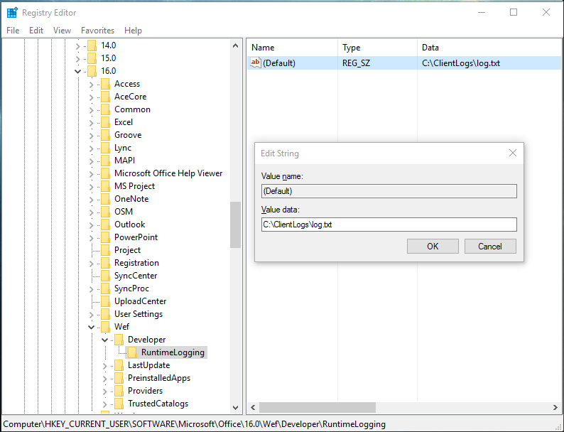 RuntimeLoggingregistry key underHKEY_CURRENT_USER\SOFTWARE\Microsoft\Office\16.0\Wef\Developer\ - Set the key's default value to the full path of the file where you want the log to be written. See sample registry key (unzip)