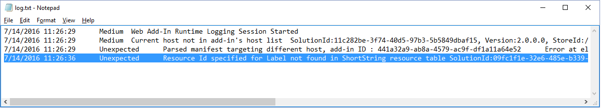 - Search for the id of your add-in, which your define in your manifest, to find messages belonging to that add-in. Logs report this id as