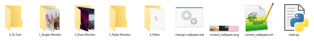 setup.pyscript in the folder that you wish to store the folder directories for the wallpapers on. The script can then be deleted. - Add enough wallpapers to the respective folders (or into the "To-Sort" folder) such that the script will have enough wallpapers to tile your displays. Not having this will likely make the script hang.