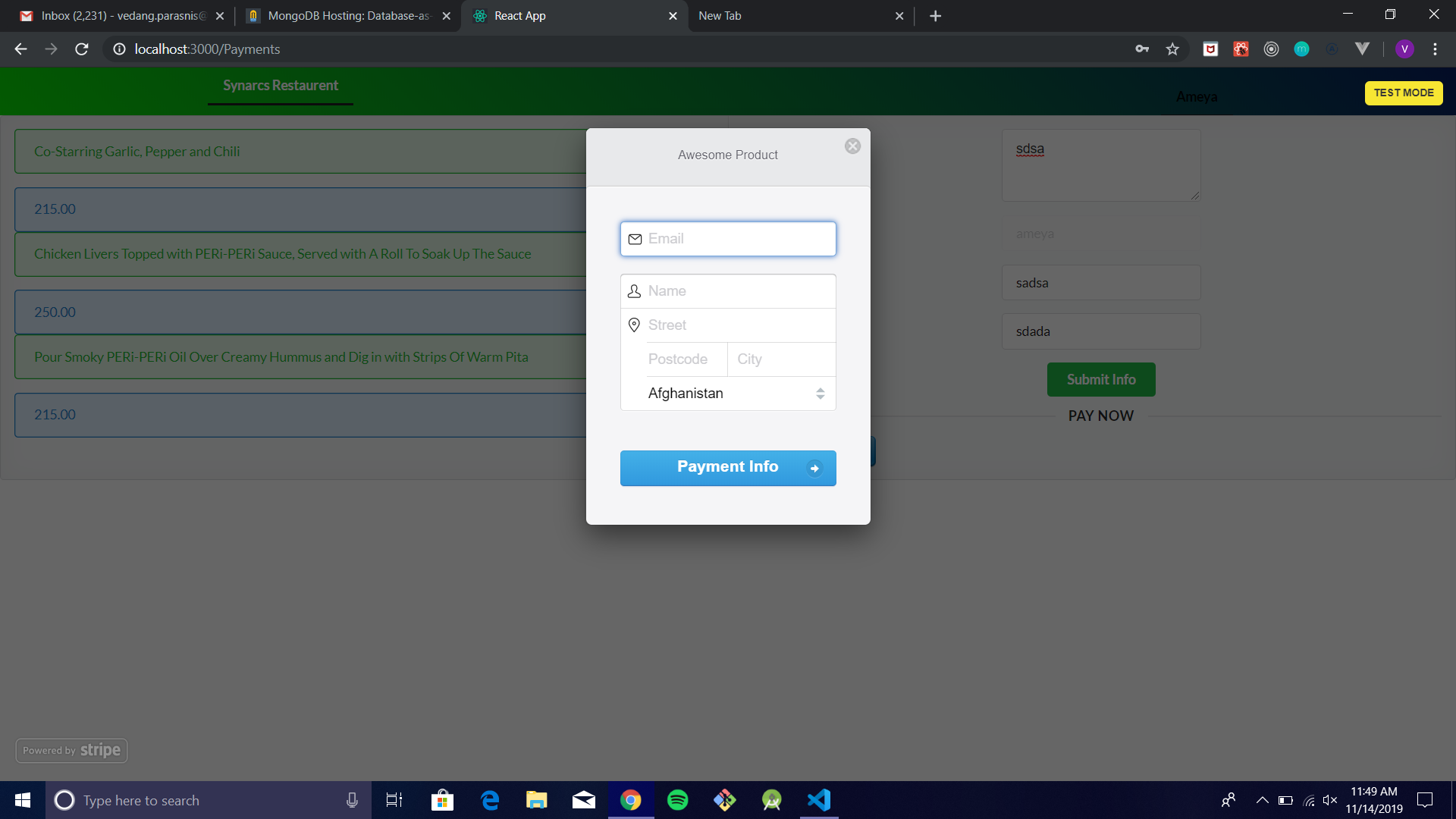 - Order Online and Online Payment 📱💳: The user can browse through various available menus and place food items in cart, in preference. Then the user can proceed to place an order, where he/she will be directed to a page to add address, other details. Then the user has to select for options to pay online or by cash. If the user wishes to pay online he/she will be directed to the Payment Module by Stripe payments. There the user can perform the money (atomic) transaction securely!!