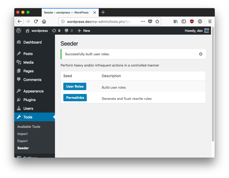] );This registers the seed with the callback of Dev\user_roles. Create a function with that name (in the appropriate namespace) and this will be the function that runs when you initiate the seed.