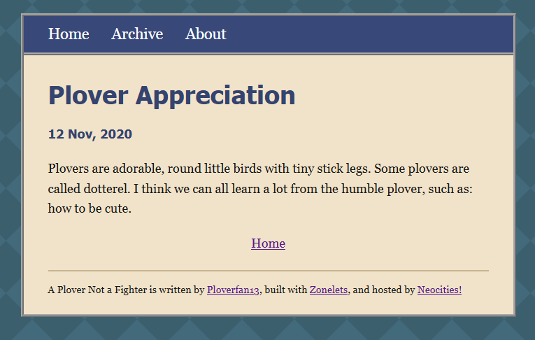 - Create a new file following the naming conventions of the example posts. For example: 2020-11-12-Plover-Appreciation.html