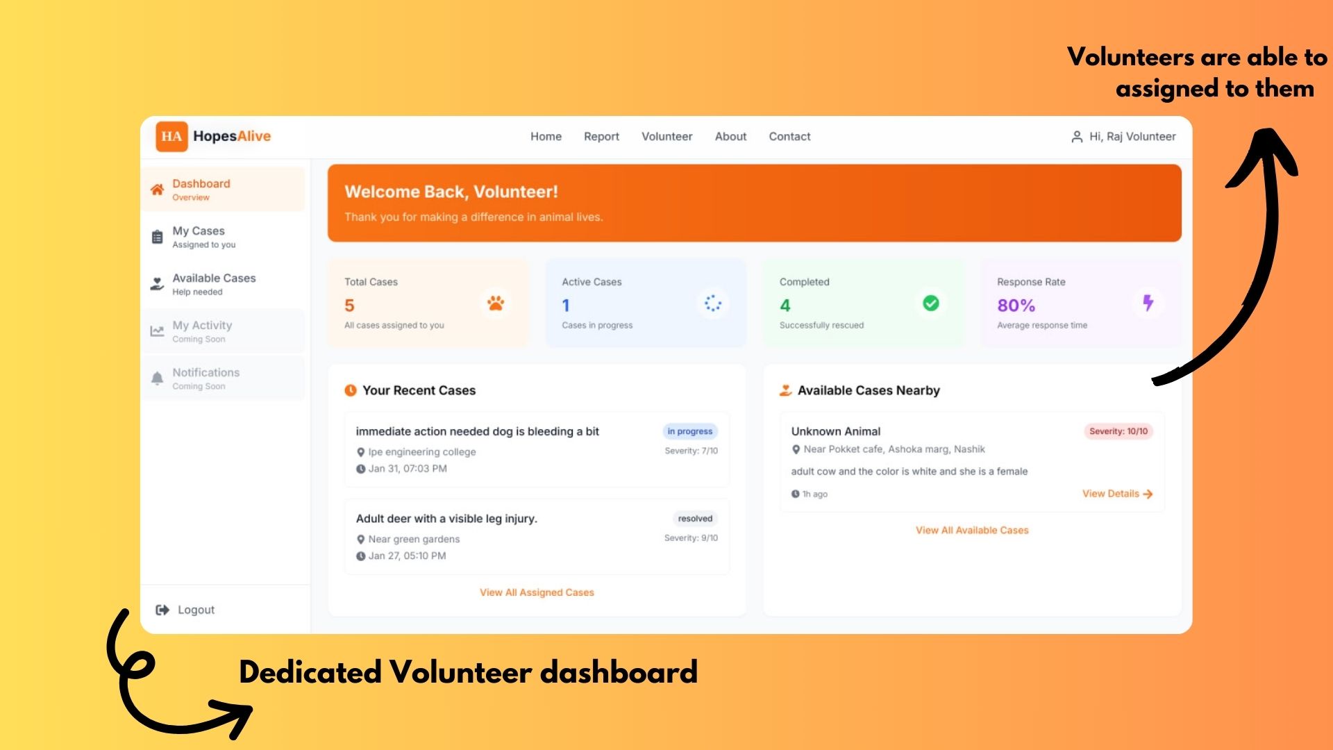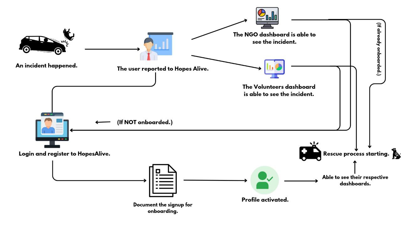HopesAlive is a comprehensive platform that connects concerned citizens, volunteers, and NGOs to facilitate animal rescue operations: