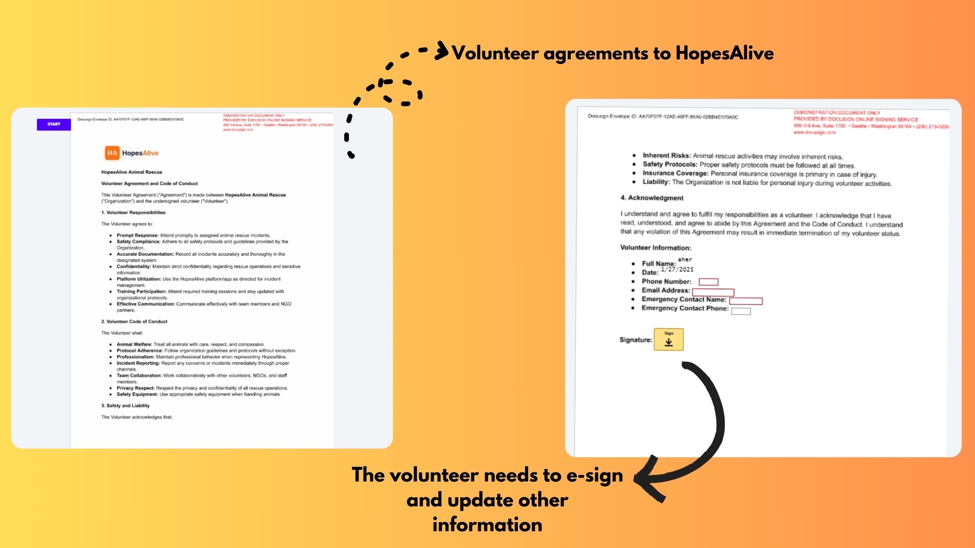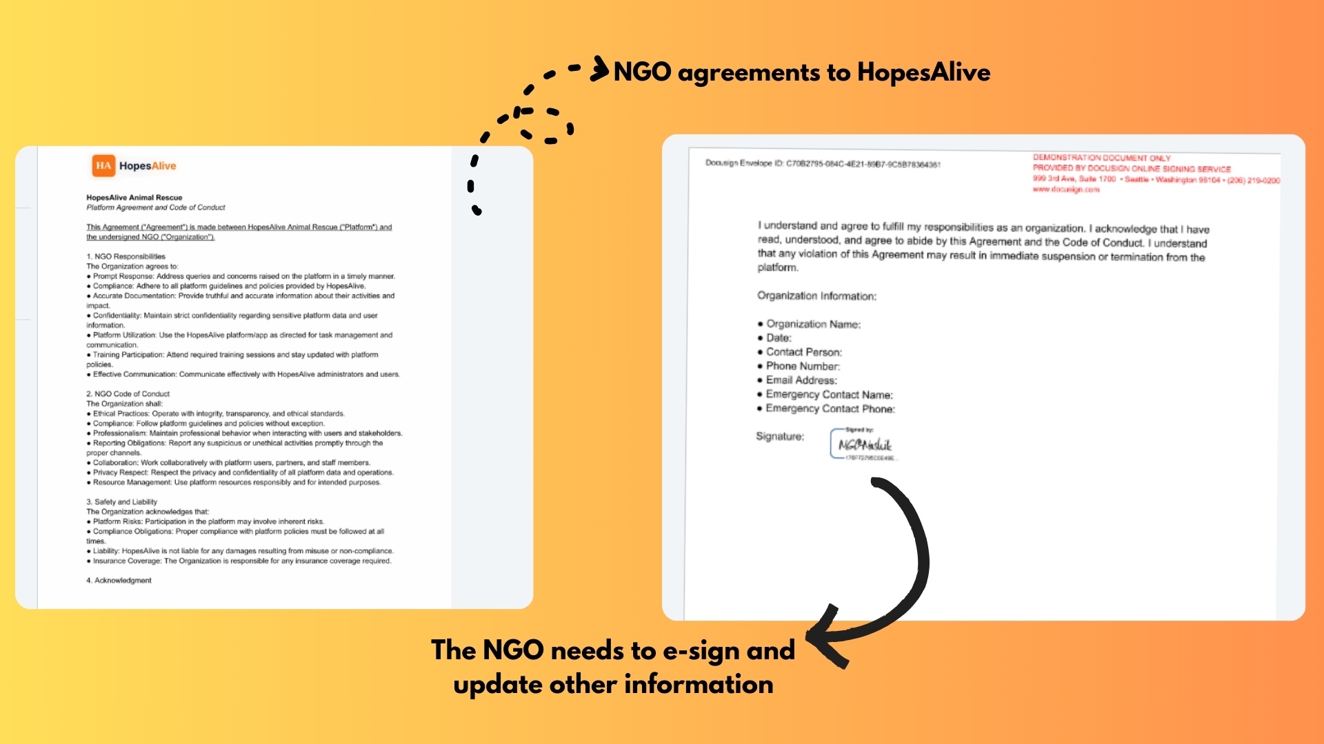 For volunteers and NGOs, we have integrated official documentation with DocuSign.