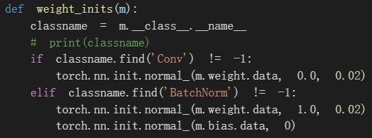 首先是Weight Initialization的部分,因為DCGAN論文內有提到Model的weight都必須由Normal Distribution(mean=0, stdev=0.02)隨機產生,所以我們寫了一個function可以直接把隨機的weight丟進model裡。