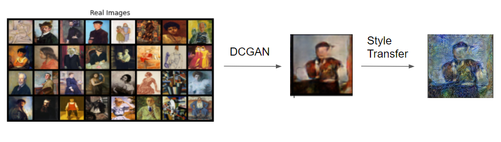 利用網路上所能收集到的各個畫風肖像畫,透過深度學習中的生成式對抗網路(Generative Adversarial Network, GAN)產生出一張屬於我們自己的肖像畫。產生出來之後,再透過深度學習的風格轉換(Nueral Style transfer),結合各大著名畫家、不同畫風的畫作,產生出長的一樣,卻不同質感的肖像畫。就相當於各大著名畫家用他們的畫風來模仿了我們畫作,讓他們在逝世的數十數百年後,被我們請出來,用他們的風格來詮釋我們的畫作。