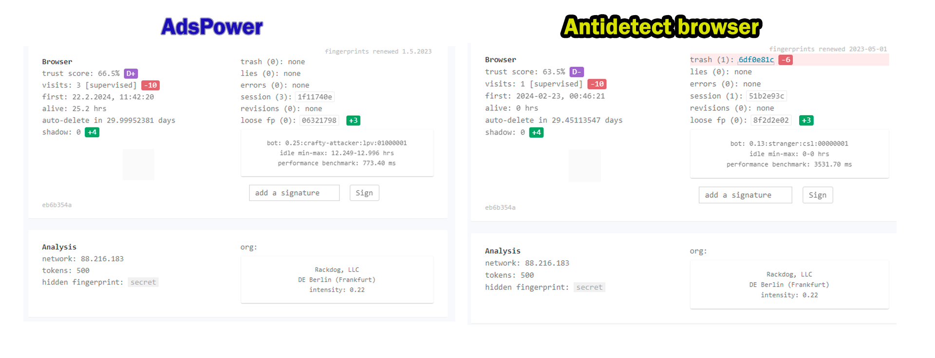 Certainly, these results are quite subjective, but you can use this data to compare the Antidetect browser with AdsPower. Providing a real assessment of browser masking is challenging, but the free Antidetect browser demonstrates a level comparable to the paid AdsPower.