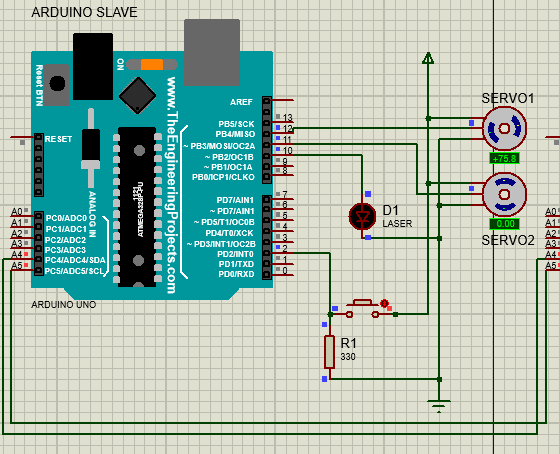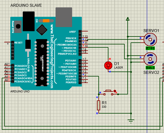 Pada Arduino slave, terdapat 2 servo 180° untuk azimuth dan altitude, serta reset button untuk mengembalikan posisi servo. Untuk menghubungkan kedua Arduino, digunakan protokol Inter-Integrated Circuit (I2C). Arduino master akan mengirimkan input pengguna kepada Arduino slave setiap pengguna menekan tombol ❉ atau #. Arduino slave kemudian mengolah input pengguna untuk menggerakkan servo sesuai derajat yang diinput oleh pengguna.