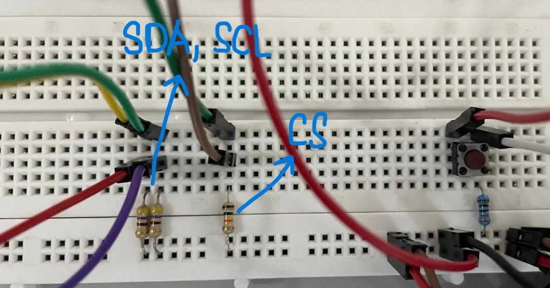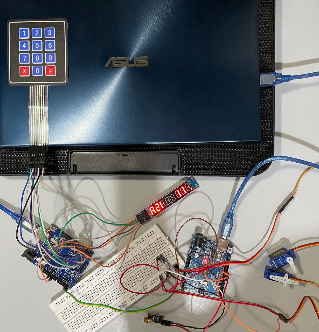 Kalibrasi yang dilakukan pada sistem ini adalah kalibrasi manual. Servo motor yang digunakan pada proyek ini ada dua, yaitu servo motor fisik dan servo motor simulasi. Kalibrasi yang dilakukan berbeda untuk kedua servo itu. Oleh karena itu, terdapat dua kode dengan kalibrasi yang berbeda (silakan melakukan comment / uncomment pada bagian kalibrasi sesuai dengan servo yang digunakan). Selain itu, terdapat juga perbedaan sedikit pada rangkaian fisik. Rangkaian fisik menggunakan resistor pull-up 400 ohm pada pin SDA dan SCL serta resistor pull-up 10k ohm pada pin CS untuk display MAX7219. Kedua resistor berfungsi agar sistem dapat berjalan dengan baik dan lancar. Berikut adalah foto rangkaian fisik dan resistor pull-up yang digunakan: