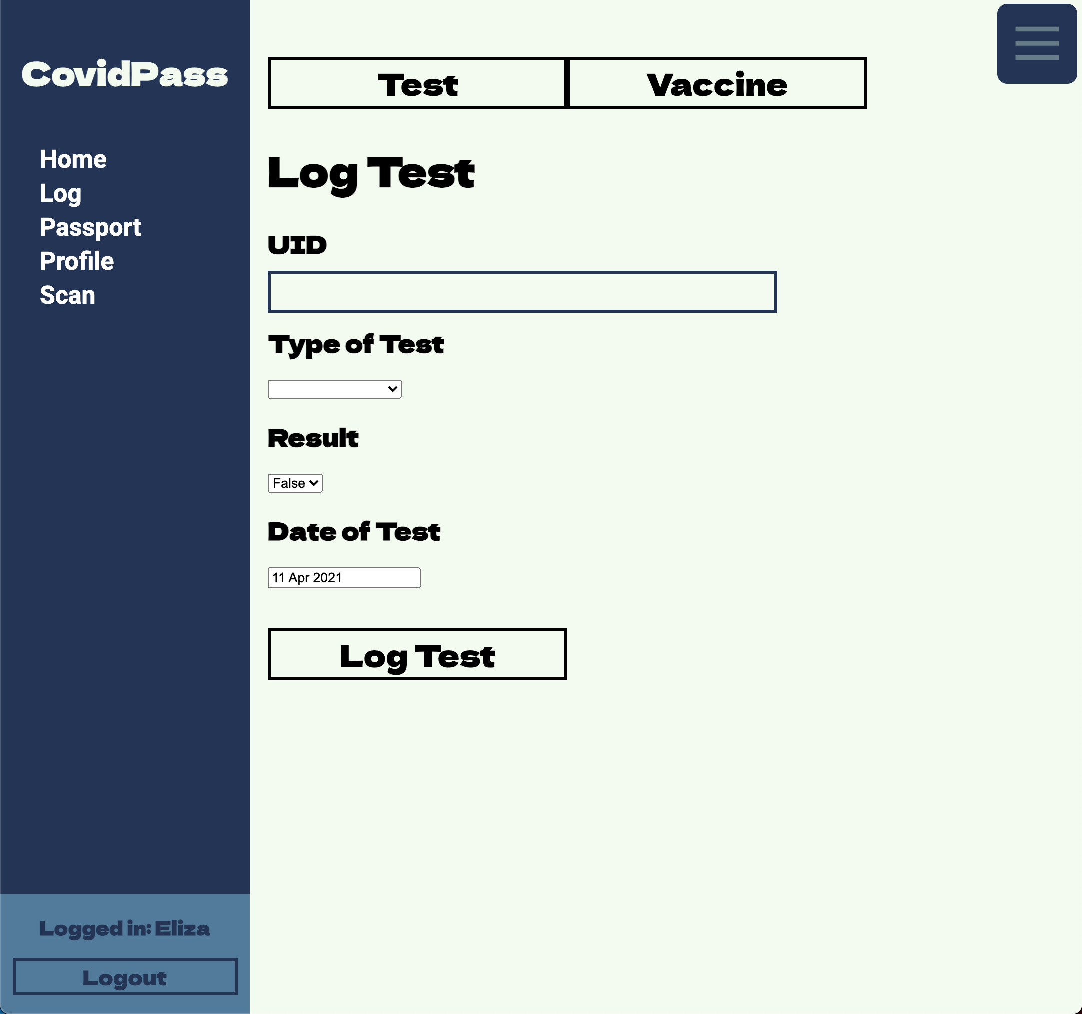 Log Vaccine/Tests (Theoretically only for GP's, Hospitals, Vaccination Centres to be able to use)