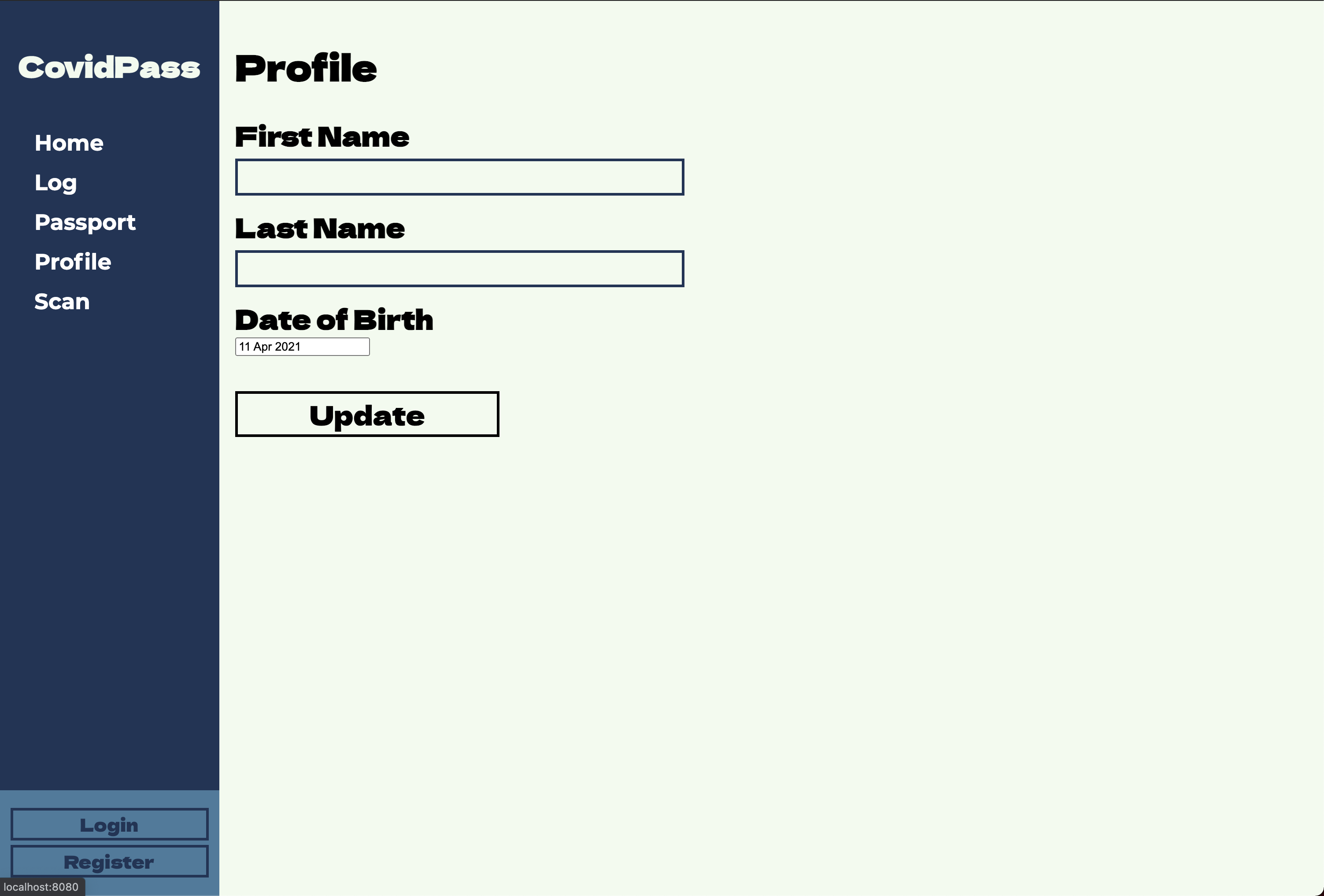 This project works on the basis it would be used to register vaccine and test results. For this, the dashboard would be split into adminstration panels, some accessible by people with specific credentials, another only accessible by a user via a Mobile App.