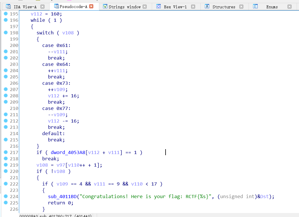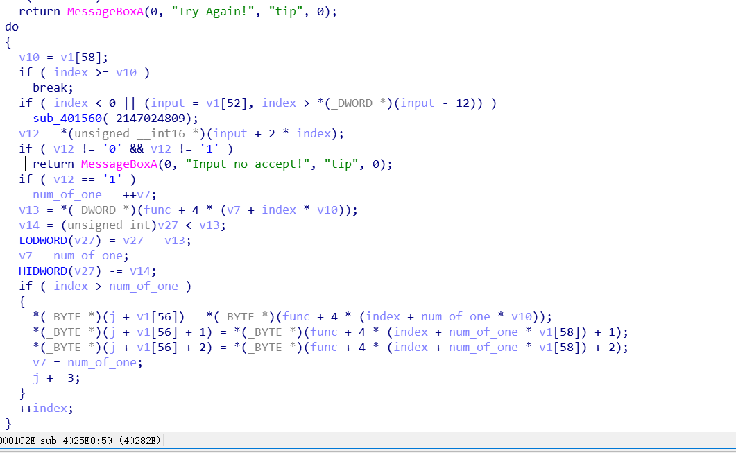 这个函数将input视为4个dword的数,然后xxtea decrypt,且解密后的字符串最后一字节要<4,至于xxtea的识别的话,可以发现它用了常数0x9E3779B9,这是标准tea家族的算法需要用的参数,然后参考这个博客:https://www.jianshu.com/p/4272e0805da3 可以发现是xxtea解密 后面再经过一个check后要输出Bingo!可以发现的是,最后一轮check并不会改变输入的值,且我们只有密文的最后两位是未知的,然后hint又给了md5,那么最后一轮就没有逆的必要了,直接爆破一下