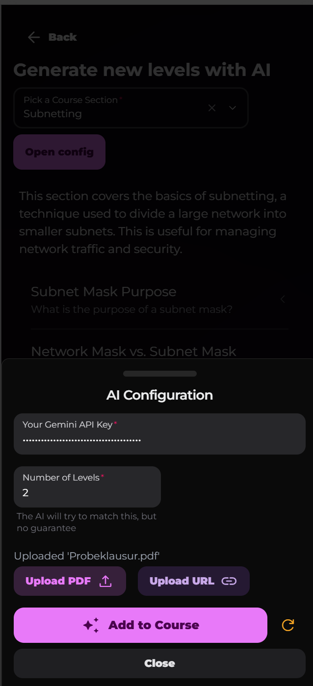 - AI Course Sections & Levels creation from source documents (PDF)