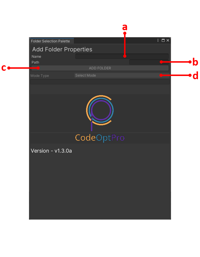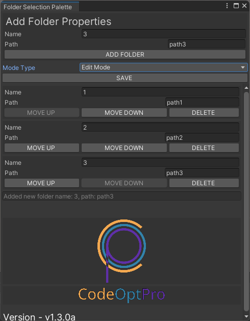 This feature allows the user to store the path locations of any folder and then by clicking the button will select that folder in the Project view. No need to look around for the important folders anymore. To open Folder Selection Palette window click the menu KamranWali then CodeOptPro and finally Folder Selection Palette. Let me explain what each field does.