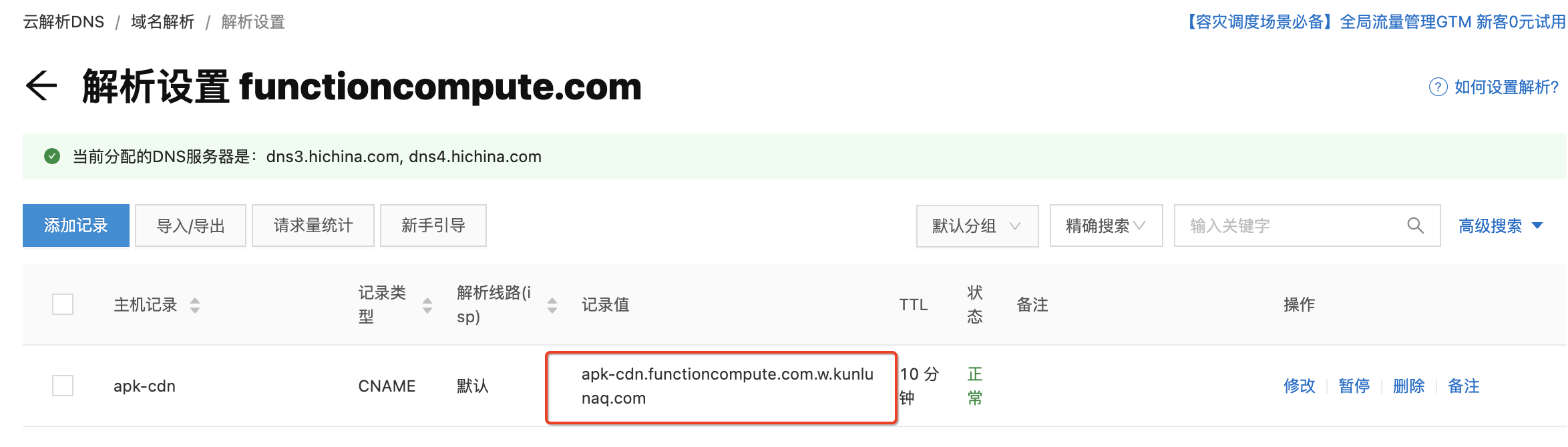 比如您有一个名为 functioncompute.com 的域名, 如下图所示, 我添加了 apk-cdn.functioncompute.com, 源站的域名为前面应用部署的访问域名 url(注意是 host,不用填写前面的 https://), 比如本示例为 get-apk-apk-repack-evbilghzjb.cn-hangzhou.fcapp.run