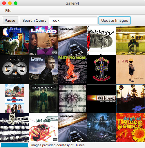Progress Bar (10 points): The application needs to have a progress bar that indicates the progress of querying the iTunes Search API, loading the images into memory, and updating the main content area of the application. Notably, the progress bar will be seen to progress when the application first starts (as images are gathered from the response to the default query) and when the "Update Images" button is pressed. Please note that this progress bar is not merely aesthetic. It should actually show the progress of gathering individual images from the query response.