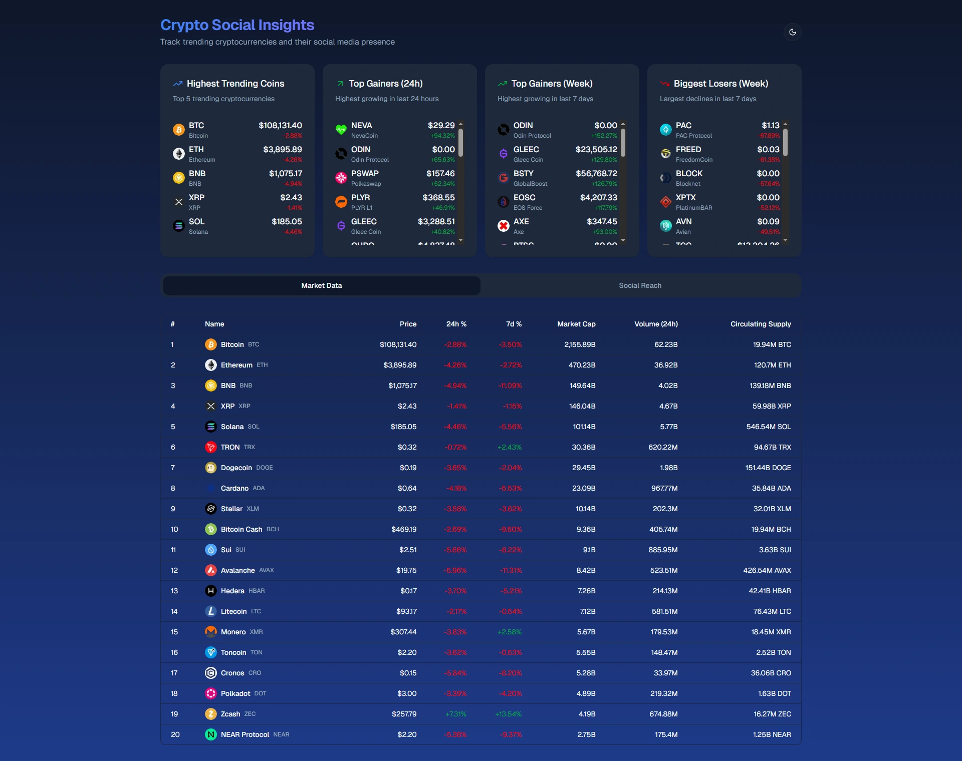 - Social Reach Table: Track cryptocurrency mentions across platforms