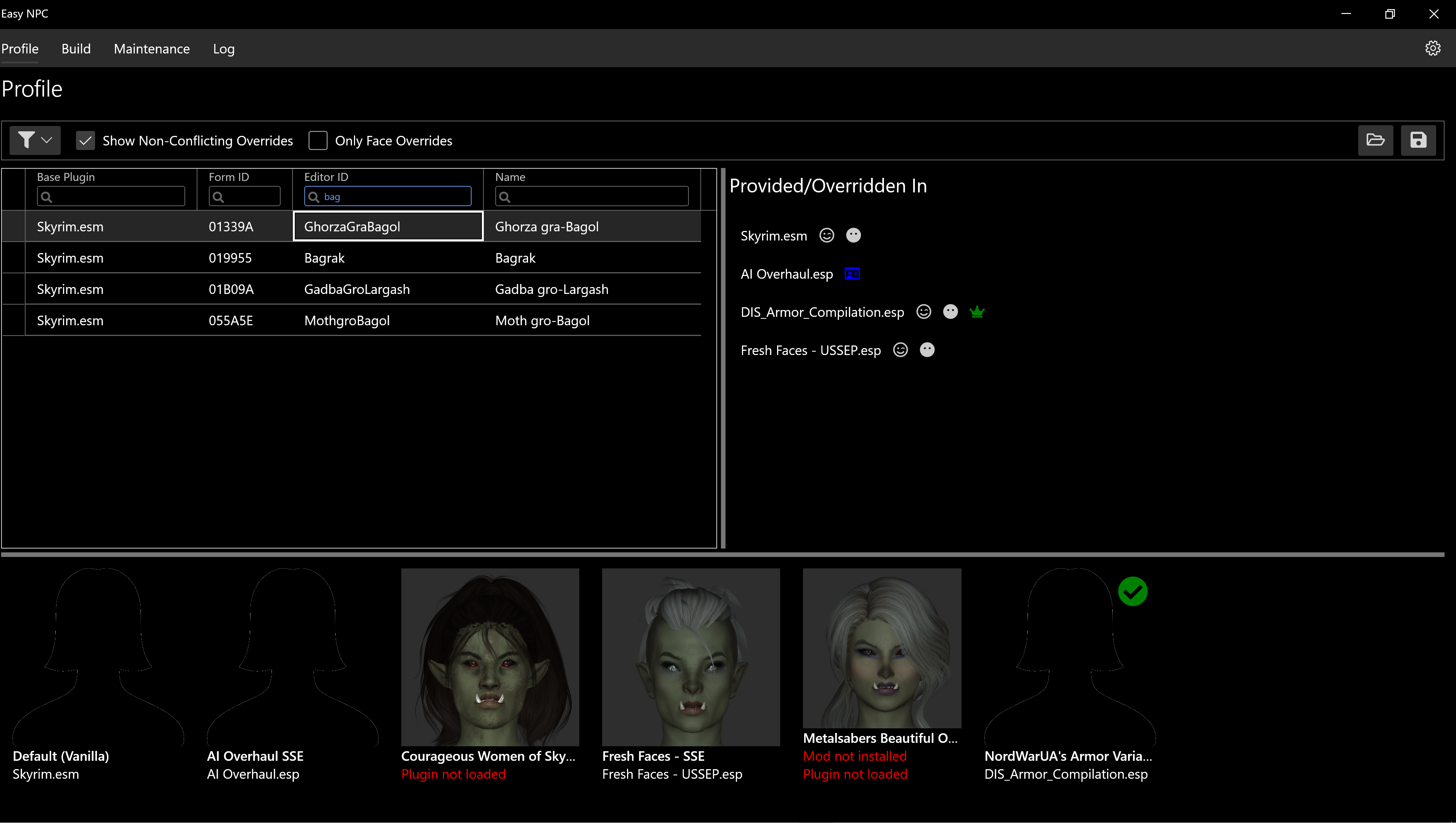 I'll reiterate that #10 should alleviate some of this, as once I get EasyNPC reading the Mod Organizer INI files then it should actually know which mods (not plugins) are active. I'll probably still have it show the mod, but greyed out or with warning text or something. However, you'll probably want to try the workaround(s) above rather than waiting, because getting this mostly-working with Vortex is a higher priority than getting super-tight integration with MO, so it'll be at least a few weeks before I add that feature. Let me know if that helps! |