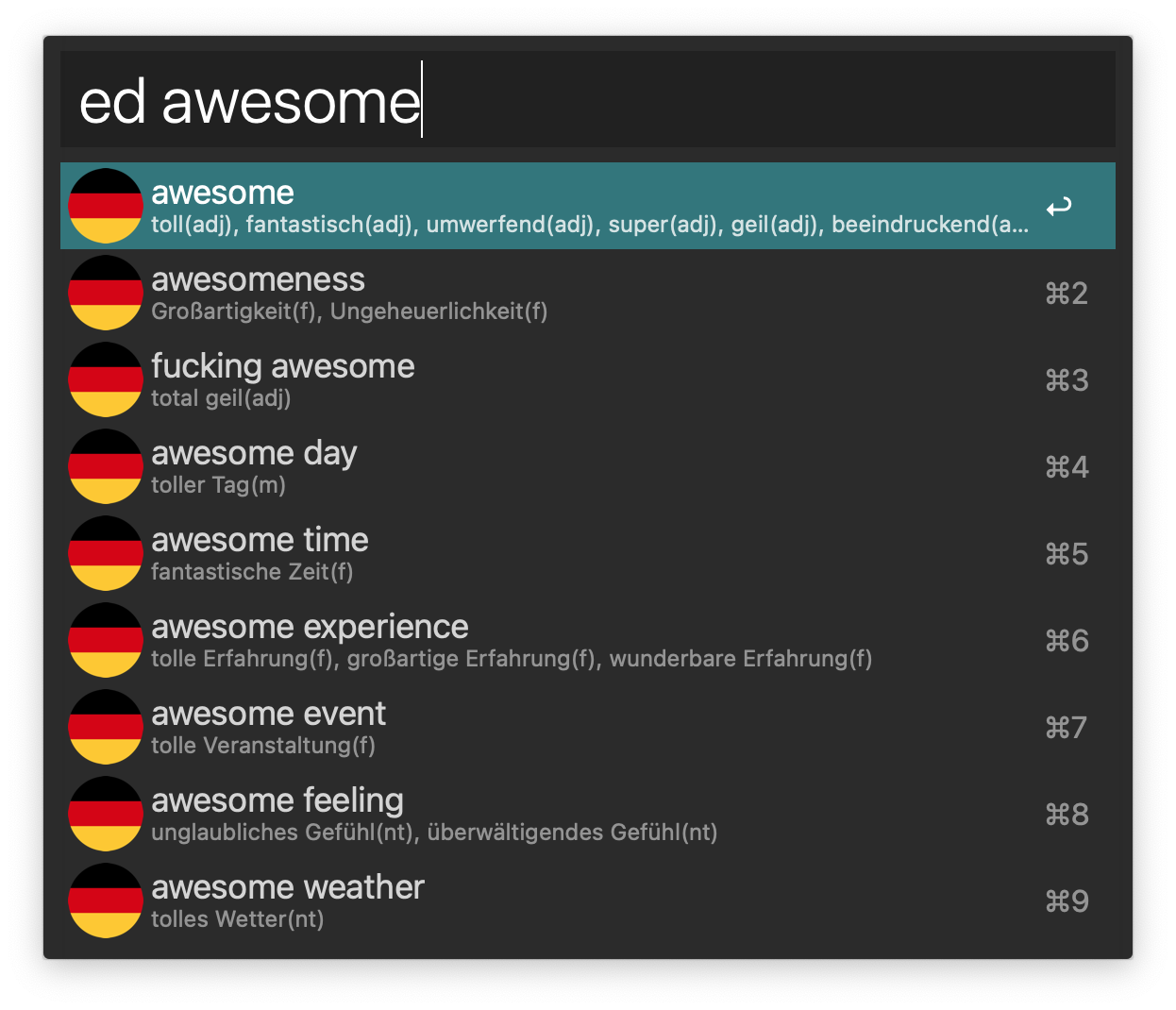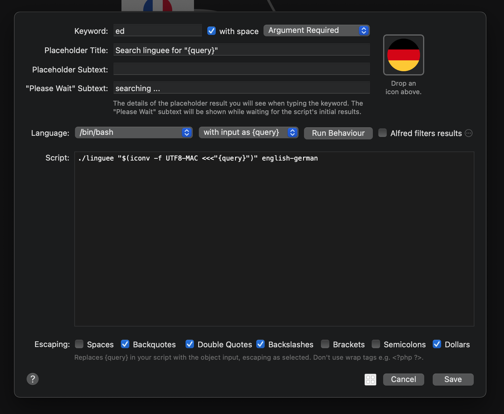 ./linguee "$(iconv -f UTF8-MAC <<<"{query}")" [source language]-[target language]